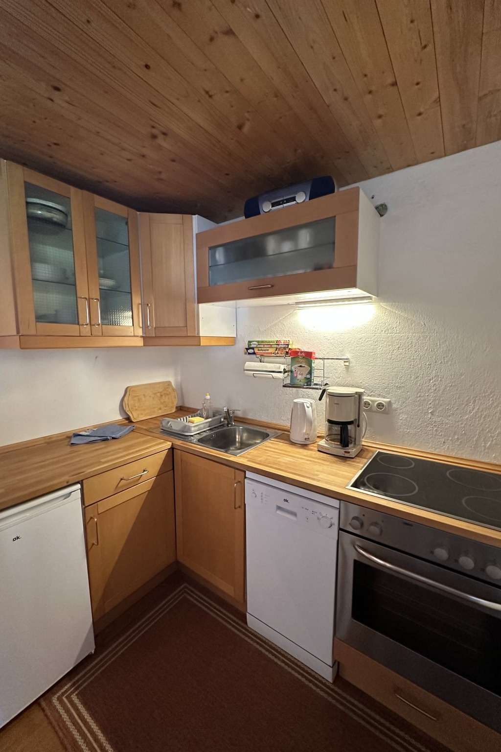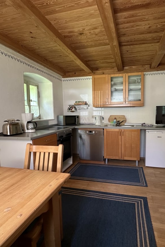 Im Untergeschoss befindet sich jeweils eine ausgestattete Küche mit Herd, Kühlschrank und Geschirrspüler. Ein Esstisch mit Sitzgelegenheit sowie ein TV sind ebenfalls vorhanden.